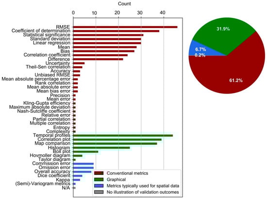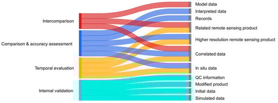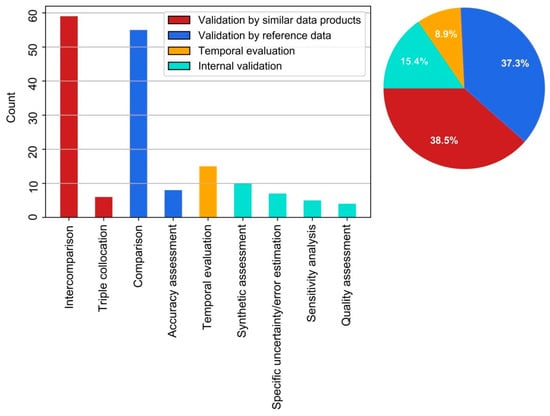 The evaluation of the applied validation methods clearly showed two mainstream validation approaches for large-scale temporally dense earth observation time-series (Figure 12). These methods primarily relied on related remote sensing data for intercomparison and in situ measurements for comparison (Figure 11). The implementation of the remaining validation categories (temporal and internal) in the investigated studies constituted to 24.3% of the studies. Notably, the combination of several validation methods in single publications was prevalent. A typical implementation was the large-scale intercomparison of related products with a parallel focus on comparisons to measurements of specific validation sites.