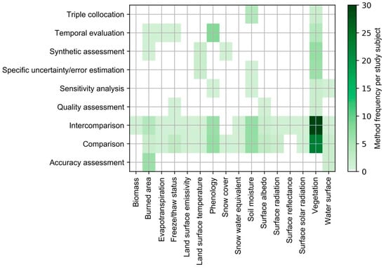 Furthermore, the application frequency of methods according to research objects was analyzed, revealing the universal utilization of comparisons and intercomparisons along study subjects (Figure 13). As the primary field of application, vegetation-focused studies were mainly validated by these conventional methods but also became subject to internal procedures. Other distinct patterns are shown for thematic-related phenology studies, which typically incorporated temporal evaluations, while soil moisture studies showed an emphasis in the field of TC, and burned area results were mainly validated by accuracy assessments.