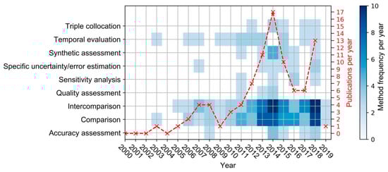 The majority of reviewed studies (61) facilitated more than one validation method. Hereby, a variety of studies showed, in particular, the combination of an intercomparison of products with a comparison to reference data [9,21,35,48,53,54,57,59,84,97,120,121,122,123,124,129,133,135,139,141,142,143,144,145]. This dual approach can provide an indication of general remote sensing performance for a particular research area or, on the other hand, illustrate improvements of novel methods in relation to existing products [35,71,136].