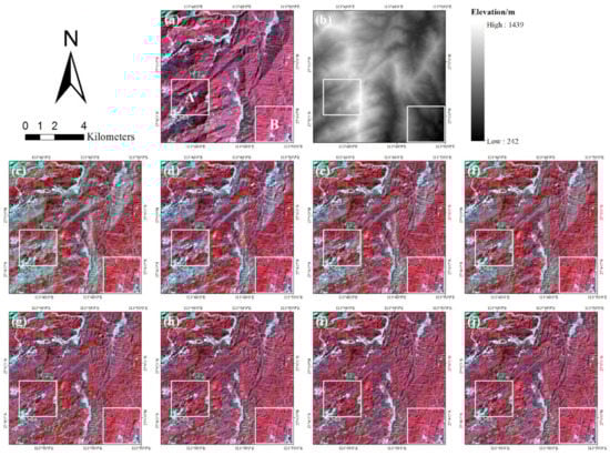 where and are the topographically corrected and uncorrected median reflectance of each band, respectively. Finally, the corrected images are obtained by Equations (1), (2), (3) and (4).