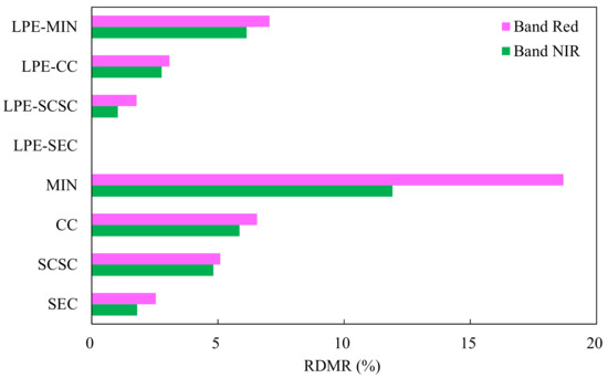 Figure 4 compares the RDMR of the traditional TC methods and the LPE-TC methods based on the Red and NIR bands. The reflectance variations are positive for all the TC methods, and smaller RDMR values mean higher correction accuracy. Compared with the traditional TC methods, the LPE-TC models have much smaller reflectance variations for both Red and NIR bands, with RDMR values smaller than 7% in most cases. As expected, the results of traditional TC models are worse, with the RDMR even close to 20% for the Red band. Overall, LPE-SEC alters the reflectance the least, with RDMR values close to zero for the two bands, followed by LPE-SCSC and SEC.