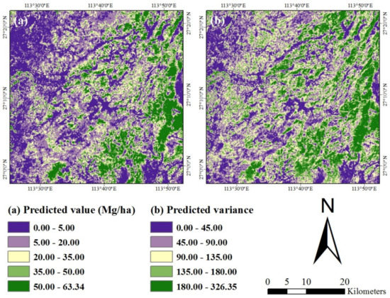 The maps of (a) forest carbon density and (b) its variances predicted by support vector regression (SVR) using the sample plot data combined with the LPE-SEC corrected image.