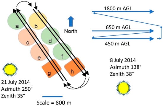Experimental layout for Unmanned Aircraft Systems (UAS) flights on two dates over six agricultural fields with center-pivot irrigation and two fields of sagebrush steppe. Fields (a), (c), (e), and (g) were always flown with a northwest bearing, whereas fields (b), (d), (f), and (h) were always flown with a southeast bearing. Flight lines were 29° from alignment with the solar azimuth on 8 July 2014, whereas the flight lines were 6° from being perpendicular to the solar azimuth on 21 July 2014. Each flight consisted of three altitudes: 650, 450, and 1800 m above ground level (AGL). Colors represent potato (light green; fields a, d, and f), spring wheat (tan; fields c and e), maize (yellow; field b), and sagebrush steppe (brown; fields g and h).