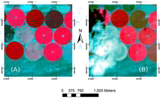 Color-infrared false-color composite of Landsat 8 OLI (path 044, row 028) reflectances acquired on (A) 8 July 2014 and (B) 24 July 2014. Because of the clouds and shadows in (B), only the southeast flight line was used for each aircraft altitude.