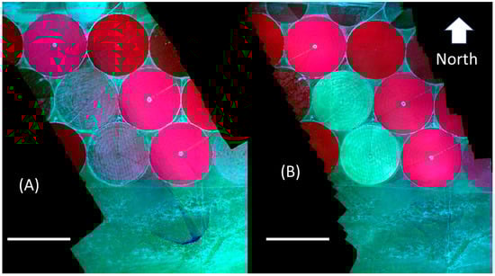 (A) Color-infrared orthomosaic image from the 8 July 2014 UAS flight at 1800 m AGL. (B) Color-infrared orthomosaic image from the 21 July 2014 UAS flight at 1800 m AGL. Crop type and UAS flight directions are shown in Figure 1.