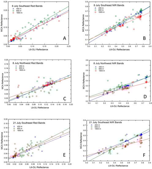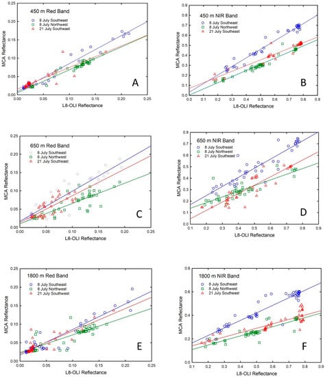 Comparison of Mini-MCA and Landsat 8 OLI reflectances acquired from southeast and northwest flight directions at three altitudes AGL on 8 July and 21 July 2014: (A) red reflectance at 450 m, (B) NIR reflectance at 450 m, (C) red reflectance at 650 m, (D) NIR reflectance at 650 m, (E) red reflectance at 1800 m, and (F) NIR reflectance at 1800 m.