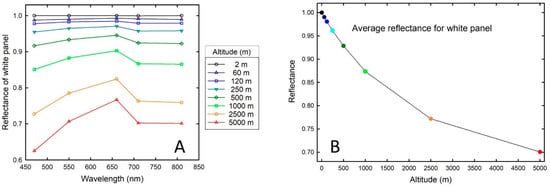 Simulated reflectances of a white panel on the ground decreased with increasing flight altitude above mean sea level (Figure 5). The larger change at blue wavelengths is the result of Rayleigh scattering, and the larger change at near-infrared wavelengths is the result of atmospheric moisture (Figure 5A). A UAS flying at 120 m above mean sea level would have a 2% decrease in average reflectance compared to reflectances measured on the ground (Figure 5B). Interpolating Figure 5B from 650 m (450 m flight altitude AGL + 200 m ground elevation) to 2000 m (1800 m + 200 m) above mean sea level, reflectance of a white panel would have an 11% decrease from about 90% to about 80%.