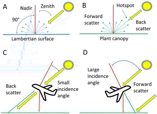 Bidirectional Reflectance Distribution Functions (BRDF) for (A) a Lambertian surface and (B) a plant canopy. Effect of plane attitude on an up-looking ILS when (C) flying away from the sun and (D) flying towards the sun. The red lines in (A) and (B) are pointing perpendicular to level ground and defining the nadir direction. The zenith angle is the direction between the nadir and the sun’s position and is the solar incidence angle on a level surface. The two red lines in (C) and (D) are perpendicular to the top surface of the aircraft and nadir view for a sensor. (C) shows the orientation for northwest flights on 8 July and (D) shows the orientation for southeast flights.
