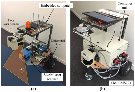 Mobile robotic platform. (a) Platform with two laser scanners for SLAM and floor scanning. (b) Platform with a SLAM laser scanner and a floor scanning RGB-D camera.