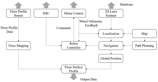 For a number of industry applications, a low cost yet accurate 3D surface profiling system is required [1]. A 3D map can easily be achieved through the use of a 3D Terrestrial Laser Scanner (TLS) [2,3,4], however, these can be costly, and therefore may not be practical for some applications. In addition, these applications can often require large areas to be scanned and processed. This makes using technology such as interferometry or lab based stylus systems not as practical despite the incredible accuracy and resolution available. Effectively mapping a terrain, in particular, a floor for use as prior knowledge is not widespread. Prior knowledge of a floor can help in navigation and decision making in numerous applications. These include; inspection tasks, cleaning, minimizing bumps in navigation of non-uniform terrain, aid navigation, and road/pavement condition analysis [5,6]. Mapping the floor, or surface profile mapping, has been achieved through similar means of creating a 2D or 3D map. Optical Interferometry can provide high accuracy and high resolution surface profiles. However, the process is often susceptible to errors due to vibration, temperature, or air flow, and this often rules it out for a number of applications, such as larger floor areas. Gao et al. [7] investigated two methods to minimize the errors due to vibration when using interferometry as a method to map the surface of a shop floor. 3D Terrestrial Laser Scanners have been able to provide high density point cloud surfaces, such as pavement and asphalt, that can then be processed into useful information [2,3,4]. These scanners are typically used as stationary measurement machines, however, Chow et al. [8] investigated fusing an inertial Measurement Unit (IMU) with an RGB-D Camera for assisting localization of a Stop and Go scanning solution. The Stop and Go style of mapping can cause increased scanning time, and combined with an expensive 3D Terrestrial Laser Scanner, is not practical for some applications. Moving an accurate yet cheaper 2D or ‘small measurement area’ sensor over the target floor can be a feasible method of reducing both time and cost, and has potential for low cost automation. Mobile Laser Scanning and Mapping systems have been of research interest since the early 1990s [9] and can provide an autonomous and cheaper alternative to 3D mapping solutions. Zlot et al. [10] investigated the use of replacing the expensive 3D laser scanners with a series of 2D laser scanners mounted on a vehicle for mapping a mining tunnel. Three 2D laser scanners were used, one mounted on a rotating platform performing 3D SLAM, and the other two mounted vertically covering almost 360 degrees. The results were promising, showing the combination of SLAM and surface mapping to create accurate 3D models. Banica et al. [11] used two sets of laser based imaging systems spatially correlated through the use of proximity sensors, odometry, and geolocation. Wen et al. [12] investigated using a single 2D laser scanner to provide localization, whilst a RGB-D Sensor provided a 3D map of the environment. A common challenge for mobile mapping systems, where Global Navigation Satellite information is not possible or reliable, is localization, and accurately matching a measurement to a global frame. Wen et al. overcame this using their fused 2D LIDAR and RGB-D Sensor using loop closure detection by particle weight as well as pose graph optimization by minimizing nonlinear error functions, helping to minimize global inconsistencies. This paper describes the development of a robotic research platform for testing the floor surface scanning and modeling capability. The research platform is designed to be easily portable and enabling fast development of control, as well as efficient testing of systems such as floor scanning. The development of the platform is discussed in terms of the mechanical, electrical, and software systems used. The algorithm for capturing the floor profile and for planning the coverage path is discussed. Initial tests of the floor surface capture system provide insight into further development and challenges. A number of the challenges are addressed and the methodology for testing as well as improving the system is analyzed. Further improvements to the robotic platform after initial testing are discussed as well as the methodology used to capture and measure the floor surface profile.