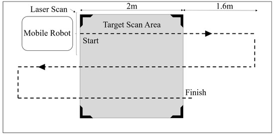 The experiment methodology for the test comparing the RGB-D camera and the Hokuyo short-range laser scanner is similar to that of the initial tests, described in Section 4. In addition to the process outlined in Section 4, a calibration step was included prior to testing to improve floor sensor accuracy and to calibrate the odometry scalar variables. Black tape was used to outline the 2 m × 2 m target area due to its different level of reflection giving rise to laser scanner measurements that successfully highlight the edges of the zone. Although the tape does not show up well on the RGB-D point cloud, the two point clouds and target areas can be accurately compared due to localization in the global coordinate system.