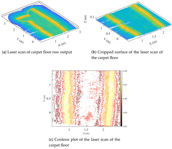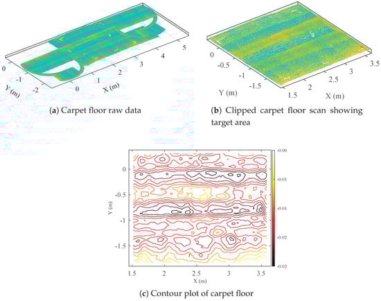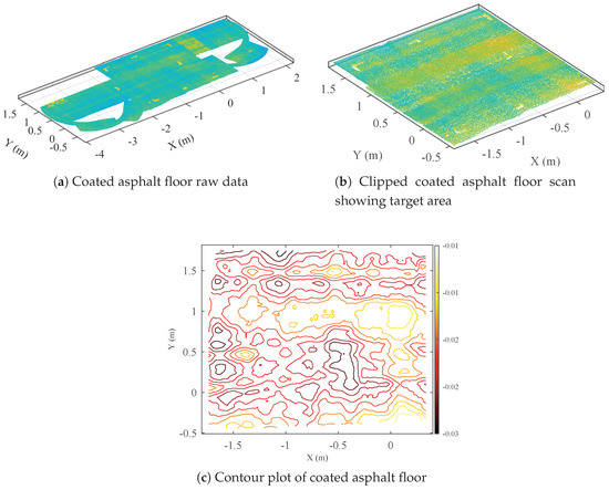The captured point cloud of each floor surface was saved as a .pcd file. MATLAB was used for processing, which involved clipping the scanned area to the target size of 2 m × 2 m. The ‘black tape’ outliers were removed by applying a threshold to the point cloud data set, and a Gaussian 5 × 5 filter was then applied to the data to smooth the resulting surface and reduce noise. The point cloud was then presented as a contour plot, indicating high and low areas throughout the 2 m × 2 m area. The surfaces were inspected by touch and visually for any deviations in flatness at key areas. These areas were noted and compared to the resulting point cloud and contour plot.