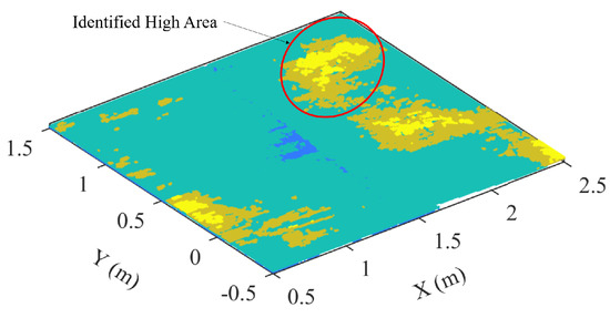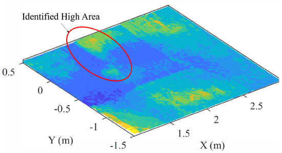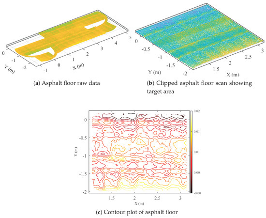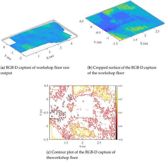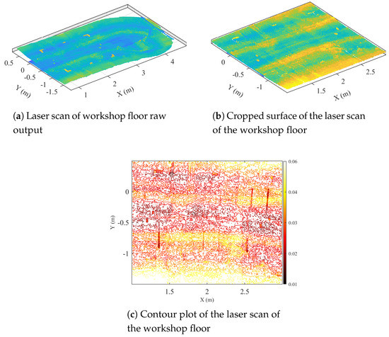 The workshop floor is an example of an indoor surface covered with dust, cracks and pits. This type of surface could be hard to map; however, from the results (Figure 6) it is clear that the scanning system could successfully create a consistent point cloud of the coated asphalt (workshop) floor. Despite the consistent low center measurement due to a systematic error, a high area was identified by the surface scanning system at the middle right of the target area (Figure 6c). This area was confirmed by visual inspection as a large step change in the floor. There are two-coin sized dents (30 mm diameter) in the floor of the workshop that the mapping system was unable to detect. However, the system did detect a general slope along the y axis.