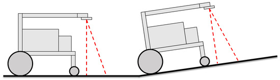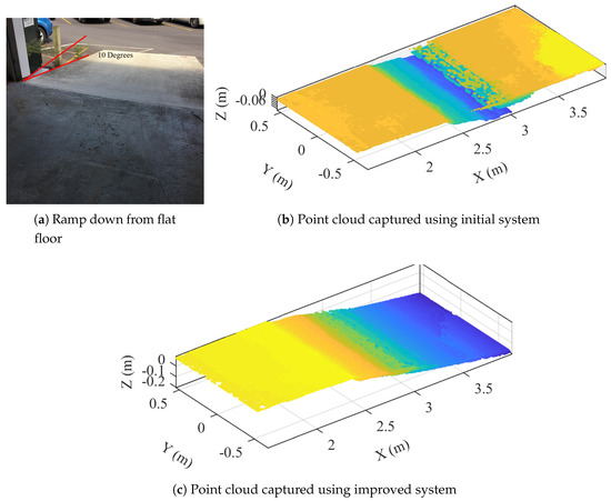 An extreme situation was tested to verify this approach, involving capture of the floor profile of a slope in the form of a 10-degree ramp down from a relatively flat floor (Figure 8a). Limitations of the previous system resulted in the floor profile being incorrectly captured, particularly due to the measurement performed being the distance from the sensor to the floor. As seen in Figure 9, when the robot is on a constant slope the measured distance to the ground is the same as when measuring on a flat floor. This, combined with 2D localization assumptions and no consideration of changes in global z height, results in the system incorrectly capturing a flat floor. To overcome this, the pitch of the robot and the global z height must be considered. To capture the floor, the robot drove forwards at a speed of 0.1 ms and recorded the resulting point cloud information. The captured point cloud using the improved capture system is shown in Figure 8c; for comparison, Figure 8b shows the point cloud captured with no z compensation or consideration of slope. There is significant improvement in the floor capture capability, with the slope of the ramp continuing to be captured even when the robot is fully on the ramp. This suggests that the z height compensation helps to extrapolate the 2D system into a full 3D capture.