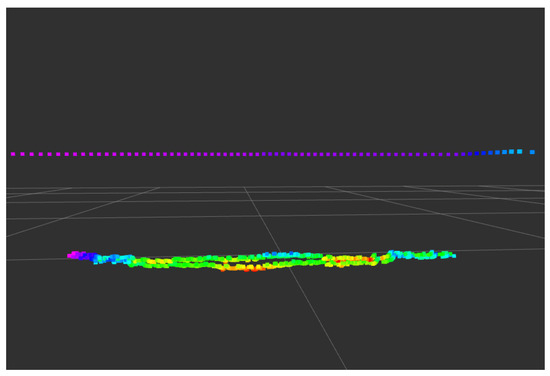 The Hokuyo short range laser scanner produces a laser scan result at angles spanning 270-degrees. The raw laser scan data must be converted from polar coordinates to Cartesian coordinates to accurately capture the floor profile. If this conversion is not performed, the laser scan has an obvious skew, which can be visualized when looking at a flat floor (Figure 11). The uncorrected laser scan of the flat floor has a bent shape (bottom curve of Figure 11), due in particular to the mapping of coordinates and changes in angle of incidence. This can be corrected through remapping the laser scan data points to the correct position relative to the angle of the scan (Equation (2)). In Figure 11, the z height is indicated by colour, with purple corresponding to the highest z value and red to the lowest. This results in a significantly improved measurement of the floor, although the scan still contains noise and measurement errors.