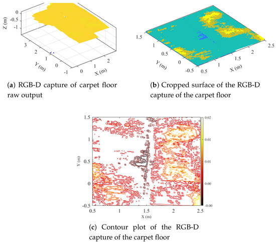 The improved system was tested using two sensors for comparison. One sensor was the D435 RealSense RGB-D camera, and the other the Hokuyo URG short-range laser scanner. These sensors were compared to identify limitations and the appropriate sensor for testing. The test was set up similar to those in Section 3: first, a 2 m by 2 m area was marked out using black electrical tape. A 2D map of the area was created using Gmapping. A coverage path for the target area was devised and the robot platform then followed this coverage path, capturing the floor surface profile. The laser scans were assembled using the laser_assembler package and then saved as a .pcd file. The RGB-D camera point cloud data was recorded in a bag file and assembled into an Octomap; the result was also saved as a .pcd file. The test was completed on two different surfaces: carpet and coated asphalt (workshop). AMCL was used to assist localization throughout the test, and an IMU was used to assist with estimation of the global z height. The point cloud surfaces were processed using MATLAB, and contour plots of the results were used to identify high and low areas. Any identified areas of deviation were investigated visually, by touch, and with a straight edge.