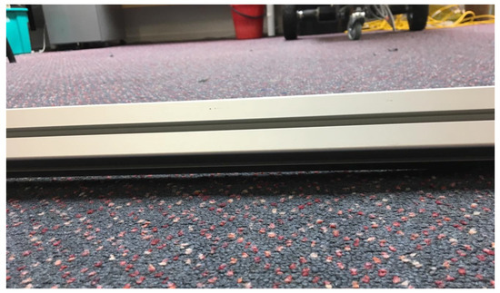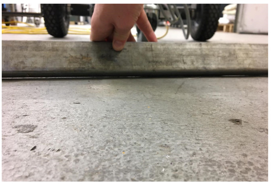 The RGB-D camera was able to highlight areas of interest, particularly high and low areas of the floor. While some errors were observed, the overall floor deviations appear to have been estimated. In the carpet 2 m × 2 m test, the sensor detected a high area in the middle of the first pass (Figure 16). This area was analysed after the test using a straight edge and was confirmed to have a deviation from flatness of around 2 mm over 200 mm of floor (Figure 17).