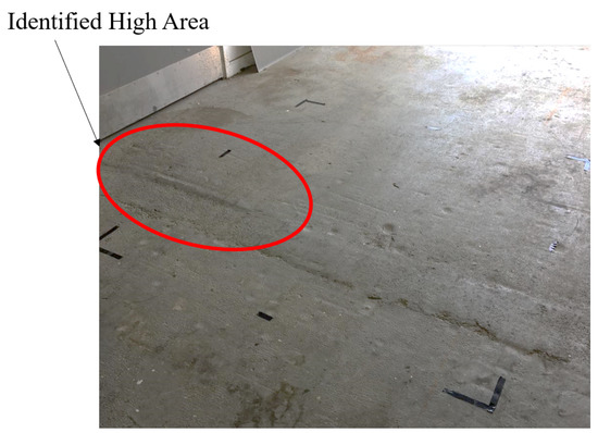 Similar performance was observed in the workshop floor experiments. Areas in the floor that had visually detectable deviations were successfully detected by the RGB-D sensor capture process. There was a significant bump in the workshop floor marked in Figure 18 that was also successfully detected during the floor capture process (Figure 19). A second area of interest was investigated using a straight edge and was also confirmed to be a deviation from flatness (Figure 20). The accuracy of these detected high areas is yet to be validated.