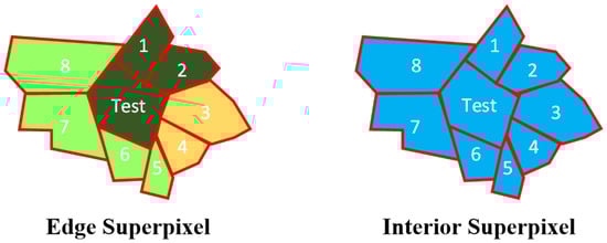 Edge superpixel and interior superpixel surrounded by neighbor superpixels (different colors represent different labels): (1) edge superpixel is the Test superpixel with green color surrounded by superpixels with different colors; and (2) interior superpixel is the Test superpixel with blue color surrounded by superpixels with same colors.