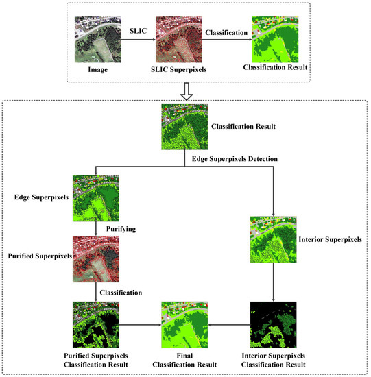Then, all edge superpixels are the detected candidate mixed superpixels. The purifying process will be executed in these edge superpixels. After purifying, all superpixels generated from edge superpixels will be reclassified. The final classification result is the union result of the interior superpixels and the purified edge superpixels. The outline of the proposed classification scheme is illustrated in Figure 4.