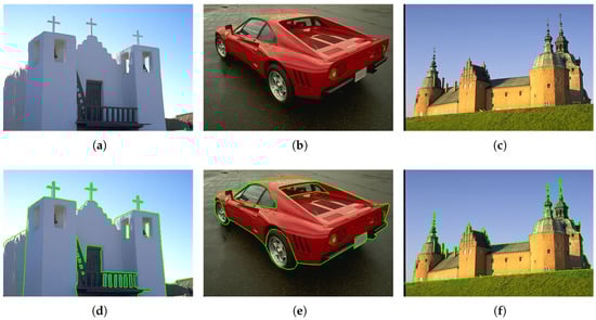 Images and ground truth segmentations from BSDS500: (a) Image 24,063; (b) Image 29,030; (c) Image 201,080; (d) ground truth of Images 24,063; (e) ground truth of Images 29,030; and (f) ground truth of Images 201,080.