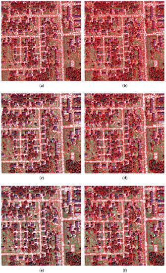 We used three metrics, namely overall accuracy (OA), average accuracy (AA) and kappa coefficient, to evaluate the performance of classification based on the purified SLIC and original SLIC superpixels in the image of the city Oromocto in Canada. As in [1], we chose the Random Forest (RF) classifier [46] to do the classification. RF classifier builds a set of trees that are created by selecting a subset of training samples through a bagging approach, while the remaining samples are used for an internal cross-validation to estimate how well the RF model performs [47]. The number of trees in the RF that should be assigned by users was set as 500, which had been shown to be sufficient in order to stabilize the errors before reaching this number of classification trees [47]. The object attributes used for classification included: (1) spectral attributes of mean value and standard deviation of each band for each superpixel, brightness, and NDVI; and (2) gray level co-occurrence matrix (GLCM) texture attributes [48] of GLCM standard deviation, GLCM homogeneity and GLCM correlation. The shape attributes were excluded because the superpixel is too small to describe the real shape information of ground object and most superpixels have similar sizes and shapes. As the test image contains four bands, the number of calculated object attributes for each superpixel is 13. In the stage of training, to guarantee the purity of sample superpixels, we filtered the SLIC superpixels with a rule that there must be a class occupying 90% pixels in the superpixel. Then, 50% of the filtered SLIC superpixels were randomly selected as samples and the remaining SLIC superpixels were used to evaluate the performance of the classification. The number of generated superpixels and selected samples with three initial superpixel sizes of , and are listed in Table 2. The color distance threshold T is 6, which is used in the purifying stage to judge whether the edge superpixels should be purified or not. It should be noted that the SLIC superpixels and purified SLIC superpixels were both classified with the same classification model, which was trained from filtered SLIC superpixels. All tests were conducted on a computer with an Intel Core i5-7300HQ CPU (2.50 GHz) processor with 8 GB RAM, using a 64-bit Windows 10 operating system.