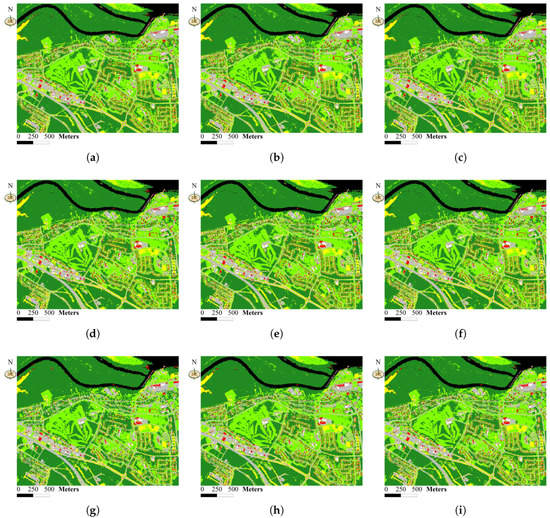 Classification maps based on different superpixels in three scales: (a) SLIC superpixels; (b) Purified SLIC superpixels; (c) Purified all SLIC superpixels; (d) SLIC superpixels; (e) Purified SLIC superpixels; (f) Purified all SLIC superpixels; (g) SLIC superpixels; (h) Purified SLIC superpixels; and (i) Purified all SLIC superpixels.