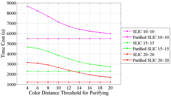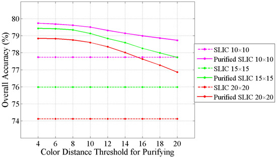There are two factors that can influence the running time of the classification based on purified SLIC superpixels. The first factor is the complexity of the test image. If the test image contains less boundary between different classes, the number of detected edge superpixels will decrease, thus reducing time cost of subsequent procedure. The second factor is the color distance threshold T used in purifying step. The color distance threshold T determines whether the edge superpixel should be purified or not according to the output of color quantization. If the T is too small, the number of edge superpixels need to be purified is large so that the number of new superpixels generated in purifying is large. Even some superpixels that are interpreted as pure superpixels by human analysis will be purified. The time cost for calculating features of new superpixels will be high. On the contrary, if T is too large, the number of edge superpixels that need to be purified is small so that the number of new superpixels generated in purifying is small. The time cost for calculating features of new superpixels will be low. However, some mixed edge superpixels may not be purified. Therefore, the T not only influences the time cost of the proposed classification, but also affects the accuracy of the classification. To investigate the influence of the color distance threshold T for the proposed classification, we ran the proposed classification with different T, from 4 to 20 with an interval of 2. The classification accuracy and time cost for each T are shown in Figure 11 and Figure 12, respectively. In Figure 11, the OA of the proposed classification continually declines with the increase of T for three scales. However, the OA of the proposed classification is obviously higher than the classification based on SLIC superpixels even with a T of 20, which is large enough for judging that two colors are similar. It means that the color difference in some mixed SLIC superpixels is very explicit. As for the time cost, the line chart in Figure 12 shows that the time cost reduces with the growing of T. When the T reaches 20, the difference of the time cost between the proposed classification and the classification based on SLIC superpixels is below 500 s. As can be concluded, the choice of T is a balance of performance and efficiency, and choosing a T which can improve the performance of subsequent processes is not difficult for users.