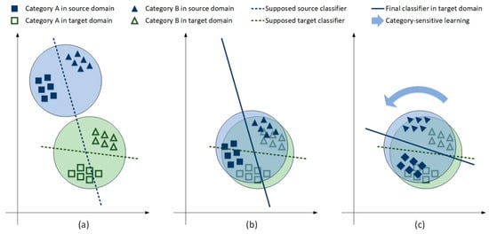 Given source aerial images with corresponding pre-labeled reference land cover maps and target aerial images without reference, the primary goal is to learn a model that can precisely perform pixel-level classification and produce correct land cover maps for the target aerial images. In our research, we hypothesize two classification models that can make correct predictions on the source and target images respectively, as illustrated in Figure 1a. At this stage, it is notable that these two classifiers are unable to distinguish between two categories of samples in each other’s domain. To eliminate the domain discrepancies between these two types of data, conventional domain adaptation methods generally attempt to conduct global domain transfer for the source images and the supposed source classifier simultaneously, then regard the transferred classifier as the final one for the target domain. Practically, a final classifier learned in this way still cannot correctly separate the two categories of samples, as illustrated in Figure 1b, where the final classifier incorrectly recognizes certain A samples as B samples. These results demonstrate that merely pursuing the marginal distribution alignment of source and target features leads to incorrect classification results in the target domain. To address this problem, our proposed CsDA attempts to apply category-sensitive learning after global domain adaptation to refine the final classifier until it can distinguish between two categories of samples in the target domain, as illustrated in Figure 1c, where the final classifier can correctly separate the two categories of samples. These findings demonstrate that simultaneously preserving global domain consistency and category-level alignment between the source and target images can lead to better classification results in the target domain.