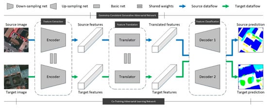 The development of domain adaptation and the advent of adversarial learning have provided new ideas for semantic labeling applications which can address the above problems. As a particular case of transfer learning technology, domain adaptation simulates the human visual system, using a labeled dataset in one or more relevant source domains to execute new tasks for an unlabeled dataset in a target domain [15,16]. On the other hand, adversarial learning technology displays its powerful capabilities in image or feature generation, and the adversarial loss is able to provide guidance for translating features from the source domain to the target domain [17]. As a result, integrating domain adaptation with adversarial learning technology has become the primary strategy for cross-domain semantic labeling and has achieved impressive performance over the past decades. Zhu et al. [18] introduced the idea of cycle-consistent adversarial networks (CycleGANs) for unpaired image-to-image translation in a pioneering work in which adversarial learning was applied in unsupervised domain adaptation, although it was agnostic to any particular task. As this idea merely focuses on pixel-level constraints and global domain consistency, directly applying it to semantic segmentation induces certain incorrect results. In this case, feature-level constraints have been considered in most recent methods. Sankaranarayanan et al. [19] proposed a strategy that employs generative models to align the source and target distributions in the feature space, facilitating semantic segmentation in the target domain. Adopting curriculum learning [20], Zhang et al. [21] introduced curriculum domain adaptation (CDA) to estimate the global distribution and labels of super-pixels, then learned a segmentation model for the finer pixels. Tsai et al. [22] utilized multiple discriminators for features of different levels to reduce their discrepancy, then achieved semantic segmentation. This method adapted features when the errors are back-propagated to the feature level from the output labels. Derived from a CycleGAN, Hoffman et al. [23] introduced cycle-consistent adversarial domain adaptation (CyCADA) for digital adaptation and semantic segmentation adaptation tasks. This method adapted representations at both the pixel and feature levels while enforcing local and global structural consistency through pixel cycle-consistency and semantic losses. Li et al. [24] integrated a CycleGAN with a self-supervised learning algorithm, then introduced a bidirectional learning framework for domain adaptation of semantic segmentation. This system involved a closed loop to learn the semantic adaptation model and image translation adaptation model alternately. Wu et al. [25] proposed dual channel-wise alignment networks (DCAN) to reduce the domain shift at both the pixel and feature levels, while preserving spatial structures and semantic information. Such approaches generally pursue the marginal distribution alignment of two types of data at the pixel and feature levels. With these strategies, certain categories of samples that are originally aligned well between the source and target domains may be adapted incorrectly to false categories, leading to unsatisfactory semantic labeling results in the target domain. Therefore, it is essential to explore category-level constraints for domain adaptation models to enhance their sensitivities to semantic class. Utilizing prior space information, Zou et al. [26] introduced an unsupervised domain adaptation method for semantic segmentation, which is guided by the class-balanced self-training (CBST) strategy. Luo et al. [27] applied a co-training algorithm in a generative adversarial network (GAN), and proposed a category-level adversarial network (CLAN), aiming to enforce local semantic consistency during the trend of global alignment. Notably, all the aforementioned methods are practically conducted on common natural image datasets, such as GTA5 [28], SYNTHIA [29], Cityscapes [30], and CamVid [31]. In comparison, remote sensing data types involve more complex characteristics, for example, the categories of land cover objects in aerial scenes generally remain invariant under geometric rotations. Therefore, these methods may be inappropriate for land cover mapping using VHR optical aerial images.