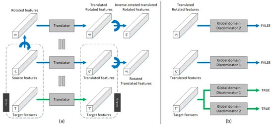 Module of the geometry-consistent generative adversarial network: (a) Feature translation, (b) global domain discrimination. The blue and green arrows indicate the data flows of the source and target features, respectively. The curve arrows represent geometric rotation operations.