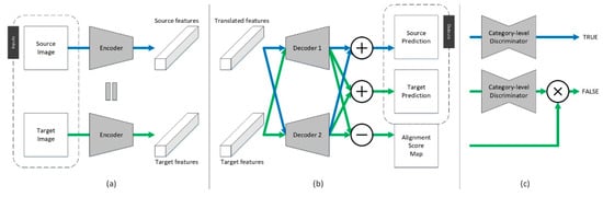 Taking a couple of source image and target image as the inputs of the feature extraction part, the source and target feature maps are defined as and , which are the inputs of the translator in the GcGAN module. Thereafter, taking the outputs of the GcGAN as the inputs of the feature classification part, the two decoders produce a source prediction map, a target prediction map and an alignment score map, which can be defined as shown in Equations (8)–(10):