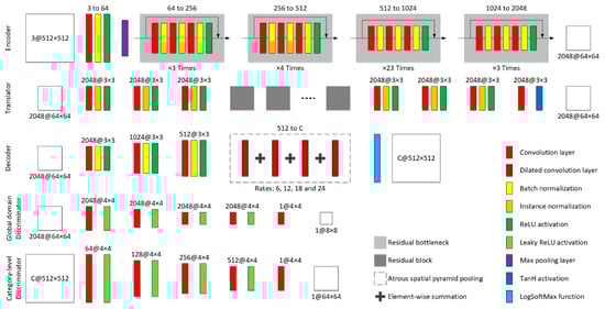 Network architectures of the encoder, translator, decoder, global domain discriminator and category-level discriminator.