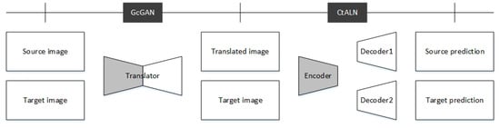 The primary goal of the GcGAN module is to reduce the domain discrepancies between labeled and unlabeled images and to retain the intrinsic information. This module is achieved by a translator and two global domain discriminators, as illustrated in Figure 3.