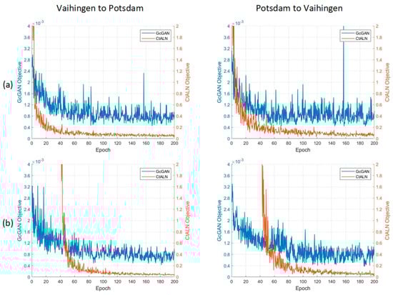 In the training process, the multi-module joint framework involves a major limitation, which was noted in Reference [59]. Taking our hybrid framework as an example, in the early period of training, the encoder and decoders updates are useless, since the GcGAN cannot achieve feature translation from the source domain to the target domain at that time. Furthermore, simultaneously training the GcGAN and CtALN modules will give wrong guidance to the encoder and decoders, leading to certain irregular oscillations on the convergence curves. To address this issue, we utilized a hierarchical learning strategy in the optimization procedure, as introduced in Table 2 in Section 3.4.2. Based on our proposed CsDA, we conduct joint learning and hierarchical learning separately in two experiments, and all the convergence curves are compared in Figure 10. As introduced in Section 3.4.2, during the hierarchical learning process, the curve of the GcGAN objective starts at the beginning, while the curve of the CtALN objective appears at the 41st epoch.