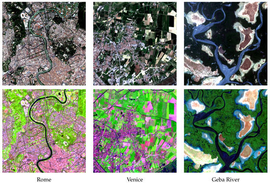 Let us now look at some sample results starting from the full-resolution context. Figure 4 and Figure 5 show some of the 512 × 512 images used for test, associated with urban and extra-urban contexts, respectively. For the sake of visualization, we use RGB false-color subsets of and . In particular, we use three out of four bands of (B2, B3 and B4), and three out of six bands of (B5, B8a and B11—see Table 1). The input components and are shown on the left and middle columns, while the super-resolution obtained with the proposed method is shown on the right.