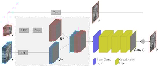 Figure 3 shows the top-level flowchart of the proposed method. As we deal with Sentinel-2 images, differently from Yang et al. [37] and Scarpa et al. [36], we have 10 input bands, six lower-resolution ones (), to be super-resolved, plus four higher-resolution bands (). Let us preliminarily point out that we train a single (relatively small) network for each band x to be super-resolved, as represented at the output in Figure 3. However, the deterministic preprocessing bounded by the dashed box is a shared part, while the core CNN, with fixed hyper-parameters, changes from one band to another to be super-resolved. This choice presents two main advantages. The first is that whenever users need to super-resolve only a specific band, they can make use of a lighter solution with computational advantages. The second reason is related to the experimental observation that training separately the six networks allows reaching the desired loss levels more quickly than using a single wider network. This feature is particularly desirable if users need to fine-tune the network on their own dataset. Turning back to the workflow, observe that both input subsets, and , are high-pass filtered (HPF) as also done by PanNet. This operation relies on the intuition that the missing details that the network is asked to recover lie in the high frequency range of the input image. Next, the HPF component is upsampled () using a standard bicubic interpolation, yielding , in order to match the size of with which to be concatenated prior to feed the actual CNN. The single-band CNN output is therefore combined with the upsampled target band to provide its super-resolved version . This last combination, obtained through a skip connection that retrieves the low-resolution content of directly from the input, is known as residual learning strategy [43], and has soon became a standard option for deep learning based super-resolution and pansharpening [2,36,37], as it is proven to speed-up the learning process.