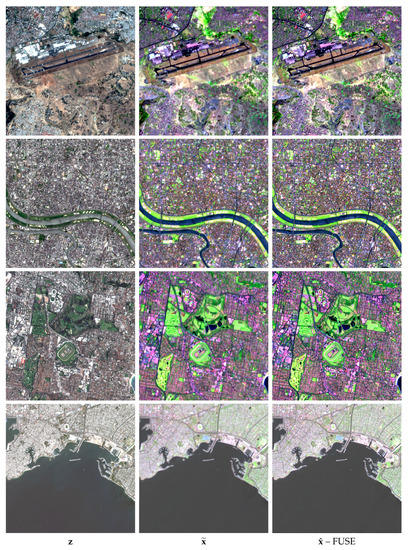 Super-resolution of the test images—Extra-urban zones. From top to bottom: Adis Abeba, Tokyo, Sydney, and Athens. From left to right: High-resolution 10 m input component , low-resolution 20 m component to be super-resolved, and super-resolution using the FUSE algorithm.