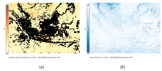 In this study, for the first time, we quantitatively assess the monsoon and inter-monsoon clear sky biomass burning aerosol radiative effect variability, focusing on local and broad aerosol emission sources and their role in constituting the atmosphere over Pulau Pinang through lidar observations. To our knowledge, it is the first time that such analysis has been performed in the region, also because endemic overcast skies make it impossible to obtain observations from active and passive satellite observations, i.e., from the Cloud-Aerosol Lidar and Infrared Pathfinder Satellite Observation (CALIPSO; [23]) or by the Moderate-Resolution Imaging Spectroradiometer (MODIS; [24]) and Landsat [25]. The hypothesis is confirmed by Figure 1, where the monthly averaged MODIS retrieved cloud fraction on December 2014 (right) is very close to 100%. This translates into unavailable aerosol optical depth (AOD; left picture) retrievals (black spots) in the South-East Asia region. For this reason, it is very difficult to establish seasonal variability of the aerosol loading, especially from satellite (only a couple of measurements per day in the best case scenario). Continuous ground-based observations are key to overcoming this problem, thanks to the much higher temporal resolution. The Universiti Sains Malaysia (USM) lidar is the only lidar deployed in Malaysia performing partially continuous measurements.