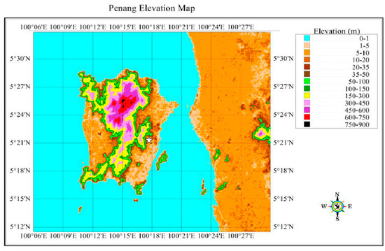Topography of Penang region with elevation in meters. The white star represents the lidar location at Universiti Sains Malaysia.