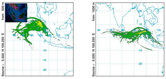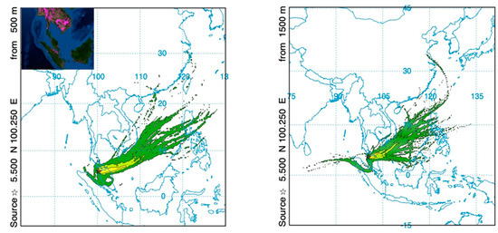 Different spatial and temporal scales influence air quality over Pulau Pinang, an island with many industrial plants leading in manufacturing activities and heavy road traffic with consequent exhaust of aerosol emissions. Surrounded by sea, the background aerosols would likely consist mostly of fine particles, typical of urban environment (road traffic, cooking, and industrial emissions) and marine particles. Due to its particular orography, pollutant transport and dispersion over Penang is subject to microscale atmospheric local circulation, mostly driven by land–water gradients. However, at a temporal scale of a few months, the boundary layer can still be considered, as well mixed, and it is possible to perform an analysis on a synoptical scale to assess how the vertical atmospheric dynamic conditions are favoring atmospheric pollutant build-up [27]. Based on the information from the Malaysian Meteorological Department [28], there are two main monsoon seasons that occur in Malaysia: The Southwest monsoon that begins in late May and ends in September, and the Northeast monsoon that starts blowing from November to March. In April, May, and October (the inter-monsoon months), it is not possible to identify a well-defined strong pattern in blowing winds. During the monsoon seasons, smoke from other remote SEA regions is advected in Pulau Pinang, degrading the air-quality. Figure 3, Figure 4, and Figure 5 show the backward trajectory analysis based on the effective lidar measurement days (139, Section 3.1) obtained from the Hybrid Single-Particle Lagrangian Integrated Trajectory (HYSPLIT; [29]) model, together with the active detected fire hotspots by MODIS. The trajectory patterns clearly trace out a seasonal aerosol advection that depends on the particular season. Penang is downwind of active fire hotspots from November to March and June to September (monsoon seasons), while local background aerosols dominate during the inter-monsoon seasons (April, May, October) [18]. The maximum number of fire hotspots are detected [30] during the southwest monsoon (June to September) [18,19] that coincide with higher aerosol optical depth (AOD). The majority of fire hotspots are detected in southern Peninsular Malaysia, Eastern Sumatra, and Indochina. In other months, a lower number of fire hotspots are detected [31]. From the backward trajectory analysis, it can be observed that during the Northeast (NE) monsoon season, the wind direction at two altitudes (500 m and 1500 m) shows similar patterns. Figure 3 puts in evidence that, before reaching Penang, the air masses transit over Indochina, where a high concentration of fire hotspots are detected (Figure 3 inset, pink spots, form MODIS). During the Southwest (SW) monsoon season, the air masses (especially at 500 m) transit over Sumatra where, again, several fires are active. Being that Sumatra is much closer to the observational site than Indochina, we can speculate that a higher concentration of smoke will be advected towards Penang with respect to the NE monsoon. On the contrary, winds during the inter-monsoon season do not show a pronounced preferred direction, and the back-trajectory analysis puts in evidence that the air masses advected over the observational site transit over regions where fire hotspots are not relevant.