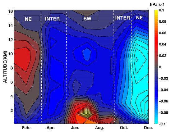 The vertical analysis on atmospheric dynamics at the observational site is based on National Centers for Environmental Prediction/National Center for Atmospheric Research (NCEP/NCAR) reanalysis for 2014. The composite omega value, designating the atmospheric vertical motion, expressed in hPa s−1, is shown in Figure 6. It can be noticed that during the SW monsoon, subsidence is present in the lower troposphere (surface/1.5 km). During the NE monsoon, again, upper air troposphere subsidence is present for January–February–March, while for November–December, air raises in the atmospheric column. During the inter-monsoon season, weak activity is present, corroborating the speculation that the aerosols are not transported from distant regions, but are local.
