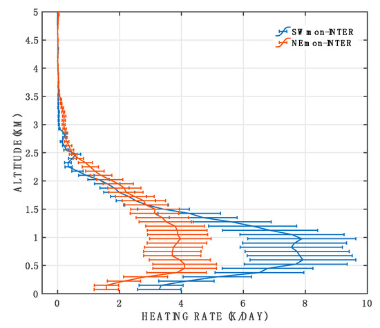 Columnar heating rate difference between monsoon and inter-monsoon seasons. On average, in the first 2.5 km, the averaged heating rate is 4.5 K/day (6.4 K/day in the first kilometer) and 2.8 K/day (3.4 K/day in the first kilometer) for SW and NE, respectively. The effect is then stronger closer to the ground. SWmon, SW monsoon; NEmon, NE monsoon; INTER, inter-monsoon.