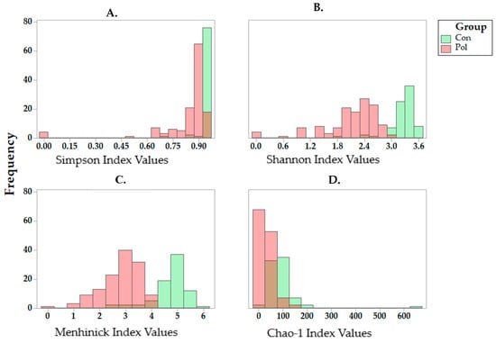 Histograms of values for (A). Simpson’s, (B). Shannon’s, (C). Menhinick’s and (D). Chao-1 indices for polluted and control transects in investigated locations computed using the Paleontological Statistics Software Package, (PAST) software.