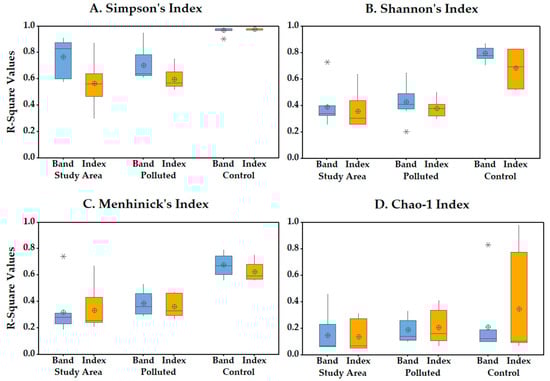 The most robust relationships occurred between Simpson’s diversity index and metrics that were derived from the PC of bands (R2 = 0.91) across the study area, Blue band (R2 = 0.89) on polluted transects, and SIPI (R2 = 0.98) on control transects. In contrast, the weakest relationships were observed between the Chao-1 richness index and spectral metrics from NDVI (R2 = 0.05) across the study area, REP2 (R2 = 0.07) on polluted transects, and CCI (R2 = 0.07) on control transects. Spectral metrics that were derived from the PC of bands consistently exhibited a strong relationship with all of the field diversity indices with R2 values well over 0.5, except for the Chao-1 index. Shannon’s and Menhinick’s indices both associated strongly with the transformed band metrics (PC of bands) and chlorophyll-based index (CCI) whereas Chao-1 richness index did not.