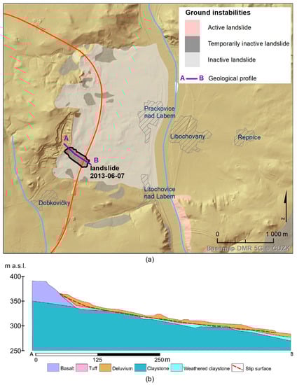The České středohoří is one of the areas in the Czech Republic that is highly landslide-susceptible. The whole area along the D8 highway section passing the particular part shown in Figure 2 is historically known for the presence of documented and in situ verified landslides of various types and age (fossil stable block deformations, approx. 40 m thick; older dormants of various shapes; young active landslides) [45]. Figure 2a shows the landslides documented in the Ground Instabilities Registry of the Czech Geological Survey; some of these landslides are still active.