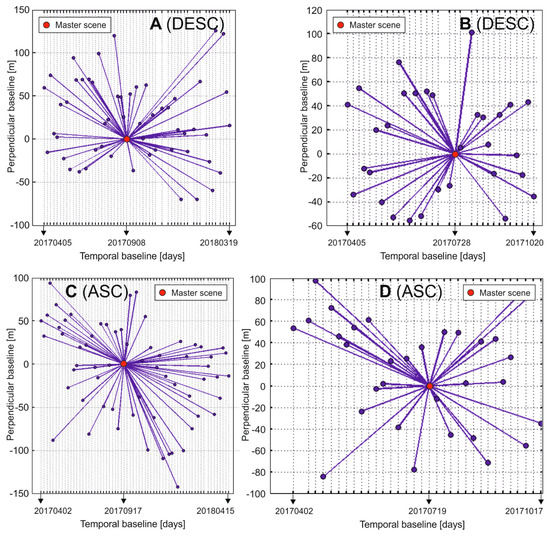 The PSI technique requires at least 20 SAR time-series images to obtain reliable results. Therefore for Scenario 2, when the PSI is employed to Sentinel-1 data, four different time series with more than 30 images for an ascending and descending pass were used (Table 1, Figure 1). These consist of two time series for each descending and ascending pass geometry, the longer one comprising the whole year and the shorter one that includes just the part of the year without snow cover. The purpose of this selection was to test the influence of possible snow cover or moisture on the PSI method. For every data stack of the time-series the perpendicular (Bp) and temporal baselines were analyzed to make sure that the Bps of the time-series did not exceed the critical value, which is about 200 m for Sentinel-1. A Bp longer than the critical value causes geometrical decorrelation, and, in such a case, the interferometric phase is not usable. As can be seen in Figure 3, the Bps of both longer time-series (A, C) did not generally exceed 200 m.