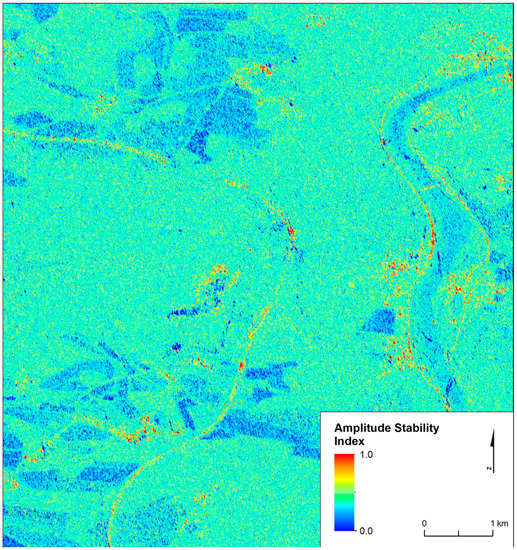 Ferretti et al. [19] recommended a suitable threshold to select the first PSs when ASI > 0.75 (DA < 0.25). In this study ASI > 0.8 was set for the first PS selection. Only a small number of points satisfy this strict parameter, however, this condition is necessary to obtain correct APS estimations. An overview of ASI values is given in Figure 6. It is evident that there are only a few places with sufficiently high ASI values, thus, fewer points (2526 from approx. 40,000) were chosen for further processing.