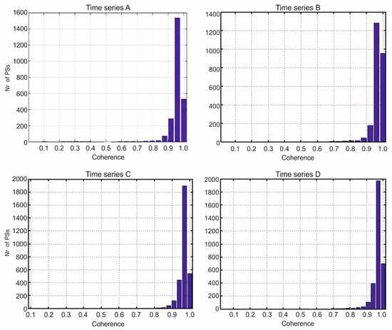 Temporal coherence of selected PSs of time series (A–D) after graph inversion and APS removal.