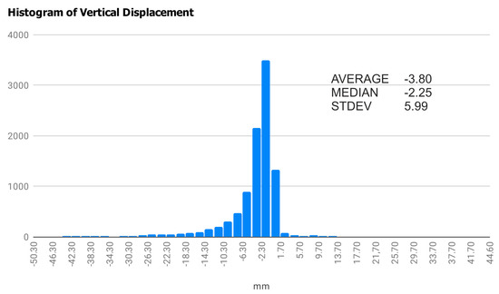 The final raster of vertical displacement was statistically evaluated via histogram and basic statistical parameters. As Figure 8 shows, the histogram has an asymmetric shape and the mean value is about −8 mm, whereas the mode is 4 mm higher. This means that most of the displacement values are negative. This can be due to the atmospheric effect, which is not removed during the single-pair interferometric process. The dataset was not further corrected, and it must be taken into account that the resulting absolute values may have a greater error.
